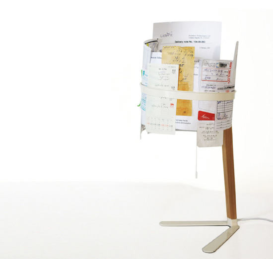 receipts, bills, diary pages are slid in between two rings and used to make a lampshade