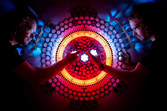 sculpture's handles, translating this information into the form of LED light.