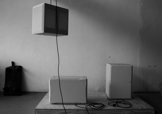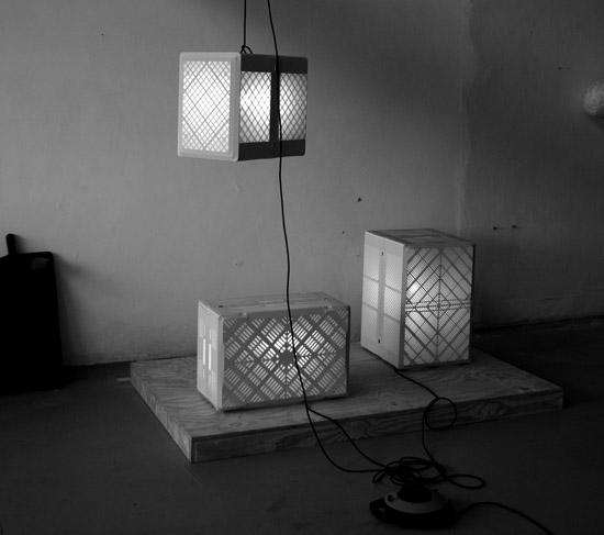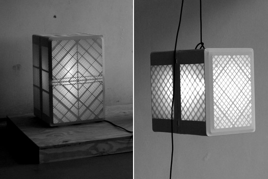 'crate'. the lamps are each made from polypropylene vegetable crates commonly found at markets to ship