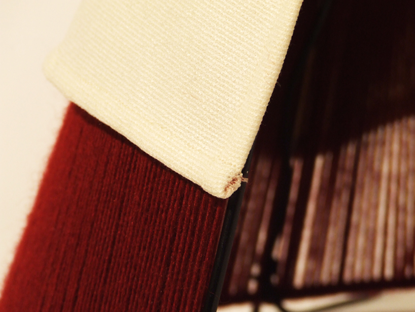hides the light source which is composed of nine warm leds. the skirt of the 'yaya' lamp is formed from a wool string,