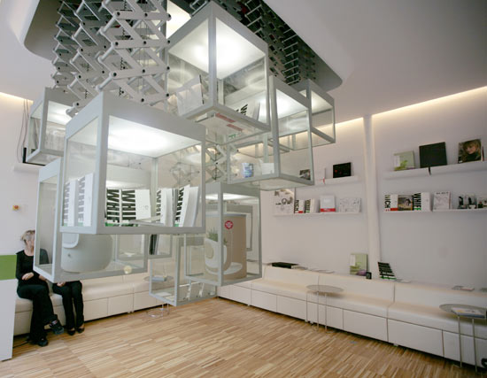 le laboratoire. the store is a bookshop by day and a restaurant by night, and thus required a unique design